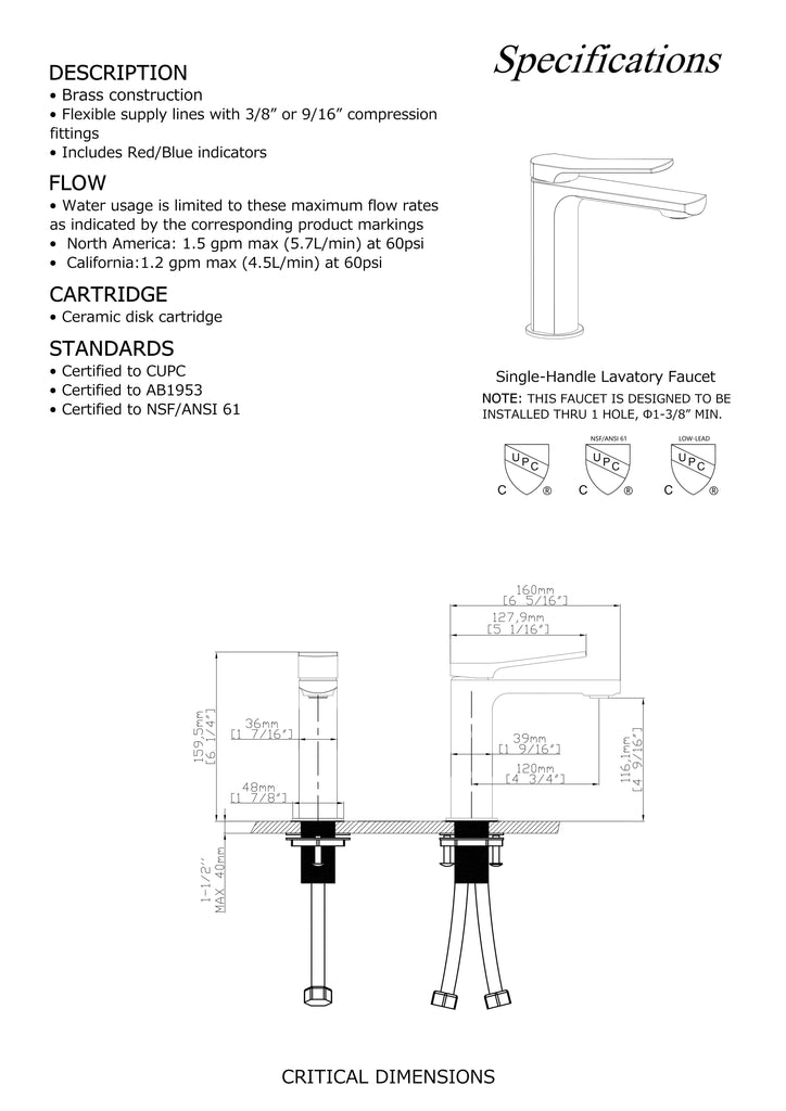 - Water flow cUPC 1.5 GPM @ 60 psi